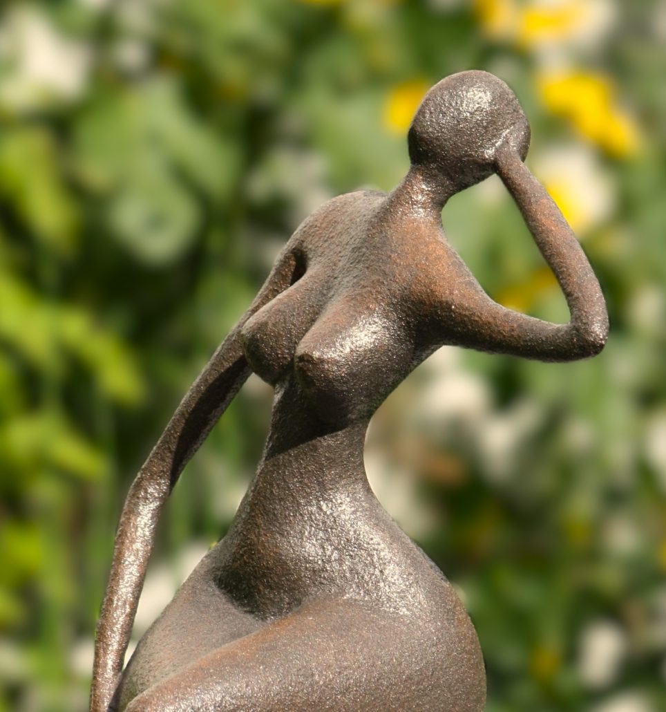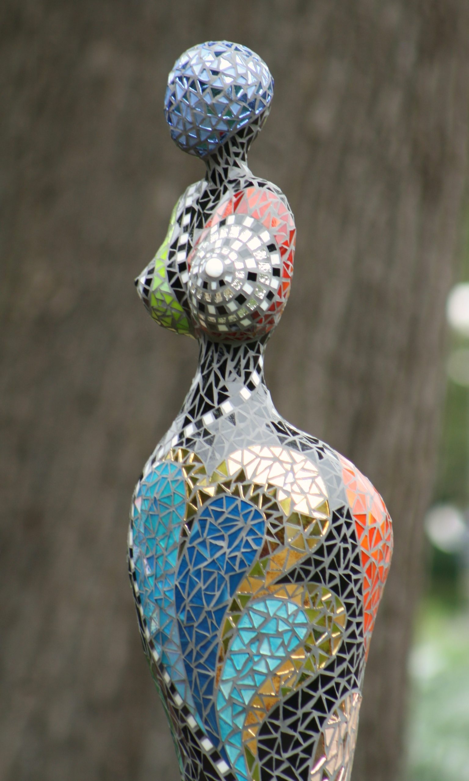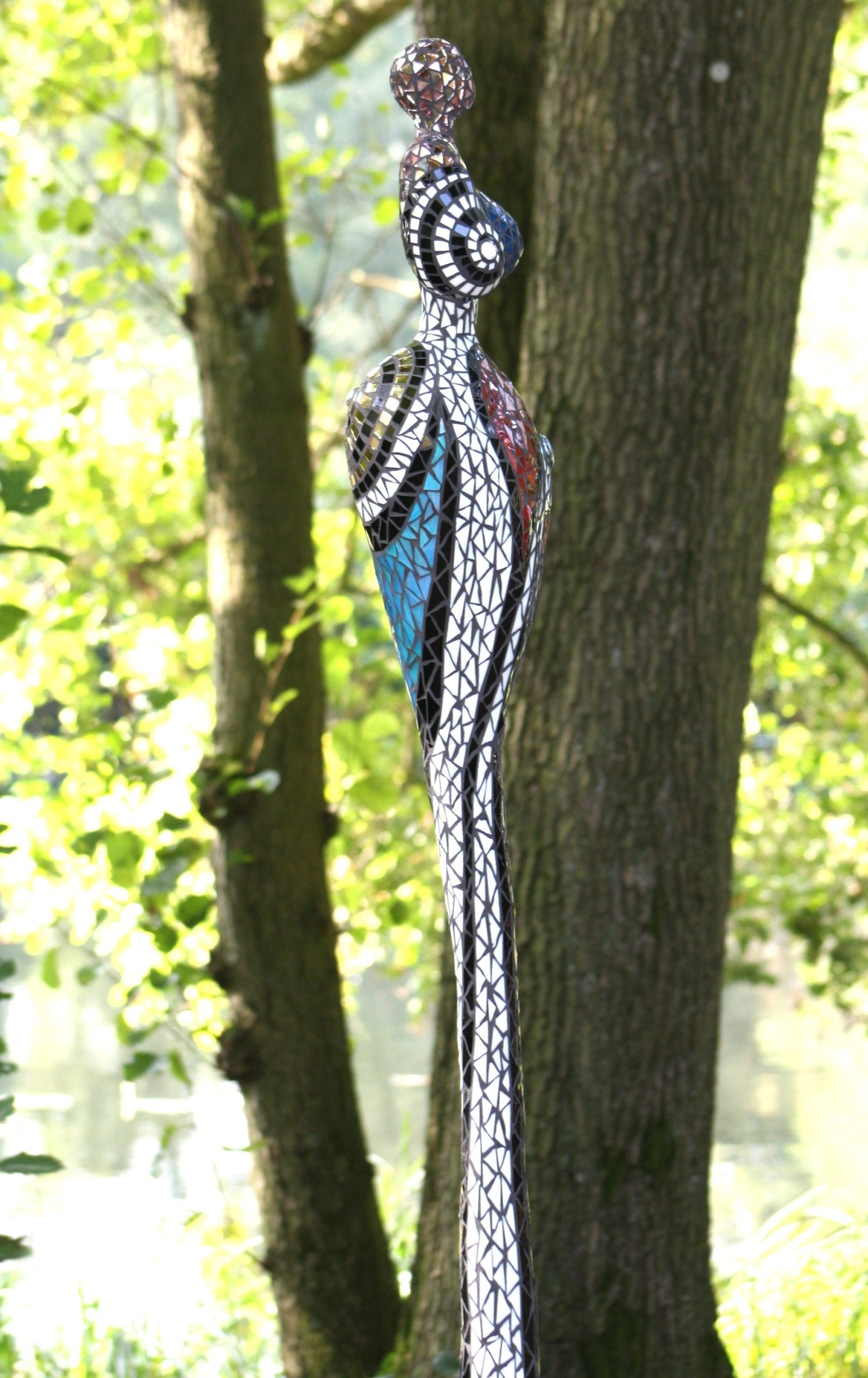 Organisch, stilisiert anmutende Skulpturen aus Eisen geschweißt anschließend mit Beton modelliert mit geschnittenen Flachgläsern ummantelt, ermöglichen Jutta Vogelsberger eine malerische, bildhafte Herangehensweise, um ihren Visionen Ausdruck zu verleihen. Diese Wechselhaftigkeit zwischen farbigen Mosaikstücken und Form der Objekte, erzeugt je nach Komposition eine eigene Spannung.