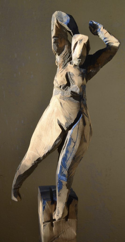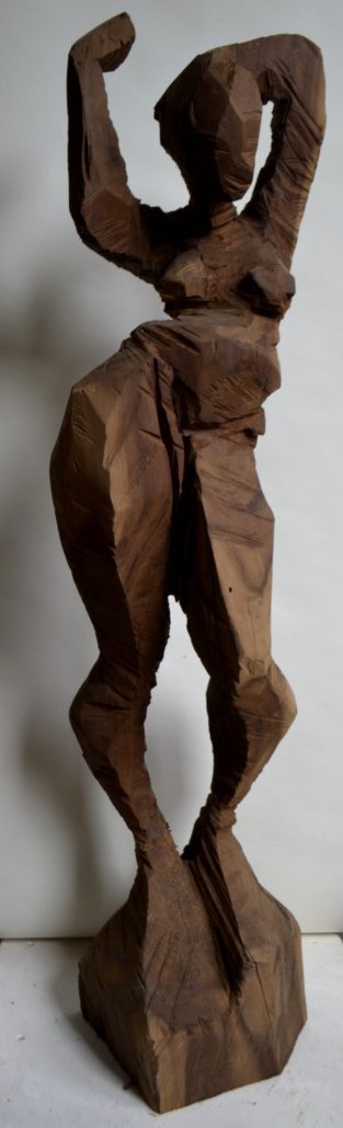 Die Werke in Holz sind durch die geraden Schnitte der Kettensäge abstrahiert. Die Textur dieser Bearbeitungsweise bleibt, ist Gestaltungselement, sowie so manche Holzoberfläche, z.b. wenn noch die Fasern zu sehen sind, wurde das Holz aufgespalten.